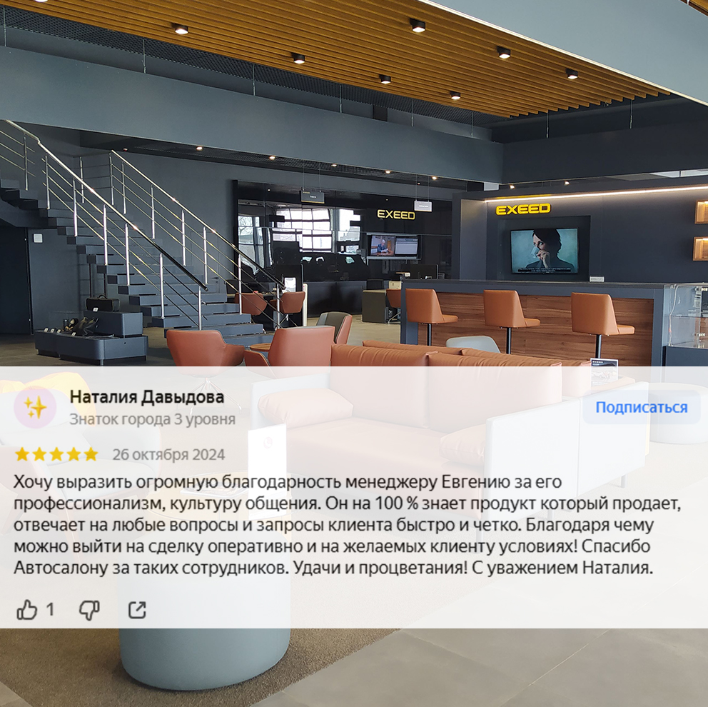 Мой опыт в автомобильной отрасли, более 10 лет, и моя высокая квалификация и знание автомобилей EXEED, подтвержденное прохождением сертификации бренда, помогут найти идеальное транспортное средство, подходящие под ваши потребности и стремления! Моя цель — сделать процесс покупки автомобиля максимально комфортным и приятным для вас.